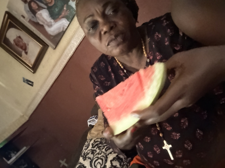 This indoor scene, located in Jos, Nigeria, captures an adult woman holding a large, triangular slice of watermelon