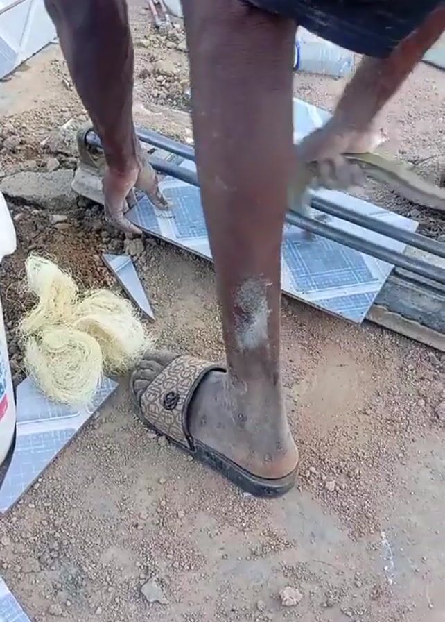 Here is a detailed description of the video: A person is cutting tiles on a construction site or outdoor work area. The individual is wearing dark shorts and sandals. Their lower legs and feet are visibly dirty. They use a manual tile cutter, scoring a blue-patterned tile placed on top of a larger gray tile. There are various items scattered around the area, including a bucket of white paint with red and blue labeling, loose strands of what appears to be sisal, and fragments of broken tiles. The ground consists of dirt and gravel. The focus is mainly on the act of cutting the tile and the surrounding environment.