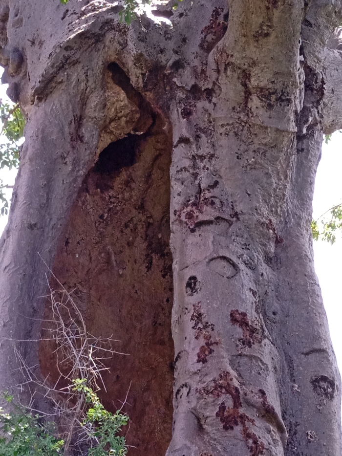 An upward-angled view captures a large, ancient tree trunk, likely a baobab, in Darajani, Kenya