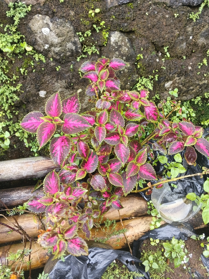 This image depicts an outdoor, close-up scene in Bien Hoa, Vietnam. The central subject is a plant, likely a Coleus variety, characterized by numerous ovate leaves with magenta-pink centers, dark purplish-brown mid-sections, and distinct chartreuse-green margins. The plant appears robust and well-foliated. In the upper portion of the frame, a dark, rough-textured stone or concrete wall is visible, heavily colonized by green mosses and small, sparse vegetation. Below the main plant, several light brown, cylindrical wooden logs are arranged horizontally, forming a structural element. In the lower right quadrant, a clear plastic bottle, cut open and containing a clear liquid, rests on crumpled black plastic sheeting. Surrounding the plastic elements and logs, damp soil with small green sprouts and plants is evident. No human figures or animals are present.