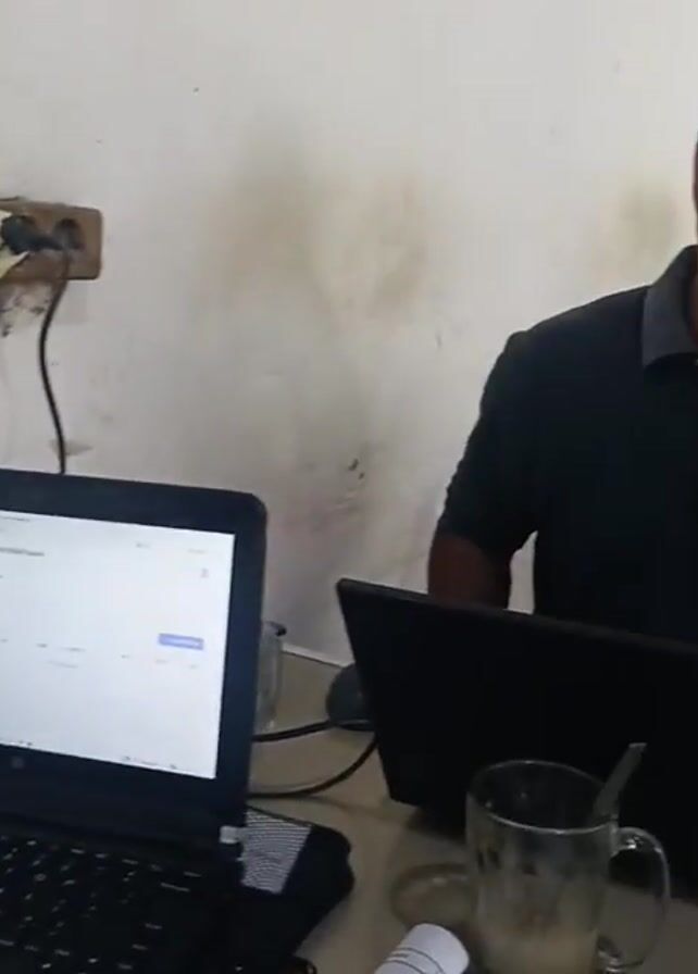 group of people sitting at a table, seemingly working on laptops. The first shot focuses on a laptop plugged into a wall outlet. Then the camera pans to a man wearing a dark gray polo shirt, sitting with his laptop open. The camera continues to pan, showing other people at the table, some working on laptops and others talking. The setting appears to be a casual outdoor cafe or restaurant. There are stacks of red chairs visible in the background, and other patrons are dining at nearby tables. The overall atmosphere seems relaxed and focused on work or conversation.