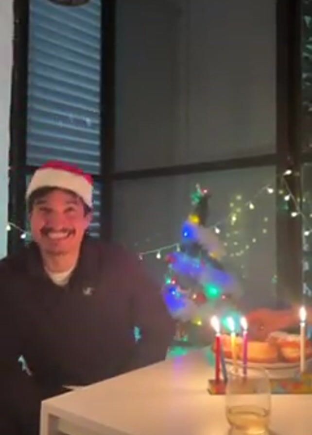 A man wearing a Santa hat stands behind a white table, smiling. There is a Christmas tree with lights in the background. A menorah with lit candles sits on the table with a plate of donuts. There is a glass of liquid on the table. The man sits down at the table.