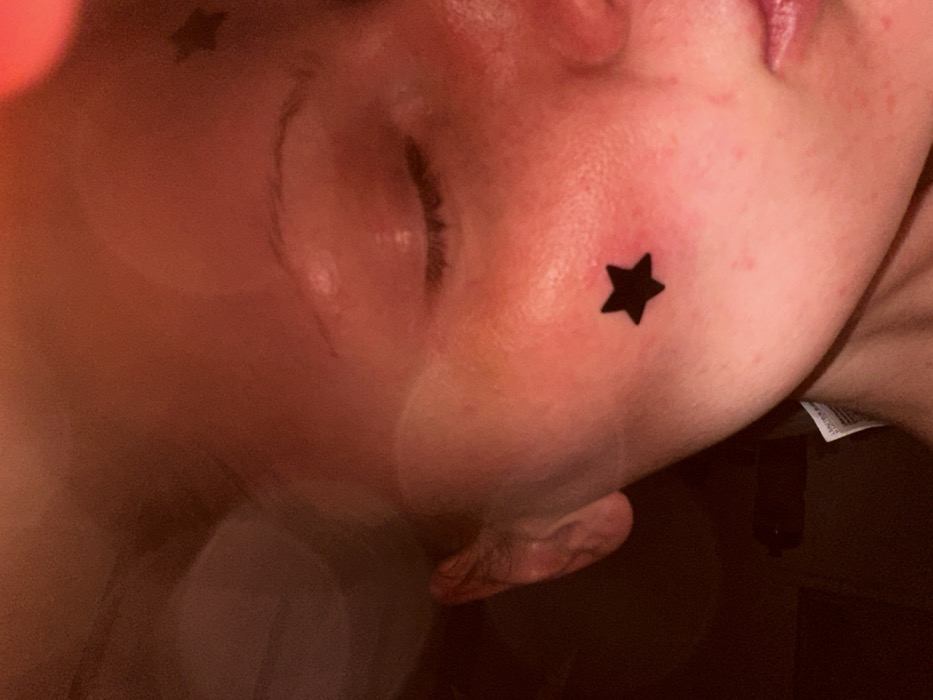 An extreme close-up depicts a person's face, turned towards the side. Their eyes are closed, and two black star stickers are visible: one near the upper left cheek and another on the right cheek. The skin is fair, with subtle redness. An ear is visible, along with the curve of the chin and lips. The overall lighting creates a warm, soft glow.