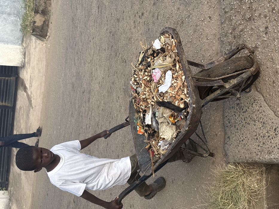 A young boy, approximately 7-10 years old, with dark skin, wearing a plain white t-shirt and dark trousers/shorts with dark shoes, is depicted pushing a heavily laden, dark metal wheelbarrow. The wheelbarrow is filled with diverse refuse, including organic matter such as dried leaves and husks, torn paper, plastic fragments, and unidentifiable debris. The wheelbarrow exhibits signs of wear, including a worn or possibly deflated tire. The boy maintains a neutral to slightly focused expression, looking forward and slightly downward as he pushes. The scene occurs on a gray, paved road surface in Jos, Nigeria. To the left, a concrete curb separates the road from a patch of dry, light-green grass. In the upper background, the lower legs of another individual, clad in dark pants and shoes, are visible walking away. Behind them, a dark metal gate and a light-colored, textured concrete building wall are present.