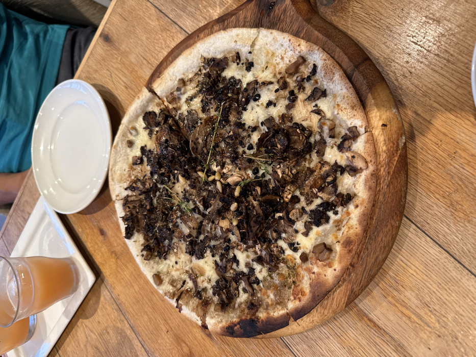 The image displays a close-up, elevated view of a dining scene, likely in a restaurant setting. The central subject is a large, round pizza served on a dark brown wooden cutting board, positioned on a light-colored wooden table composed of planks. The pizza features a thin crust with charred edges, topped generously with various dark, cooked mushrooms, melted white cheese, scattered pine nuts, and several small sprigs of fresh green herbs, likely thyme. One slice of the pizza has been removed from the upper right quadrant. To the upper left, two clear glasses containing an orange-hued beverage are placed on a rectangular white ceramic tray. An empty, round white ceramic plate is situated further back on the table, to the left of the partial figure in the background. A person is partially visible in the upper background, seated, wearing a teal-colored t-shirt and dark-colored shorts or pants. Only their torso and upper thighs are discernible. The precise location within Yokohama, Japan, is not identifiable from the visual content of the image.