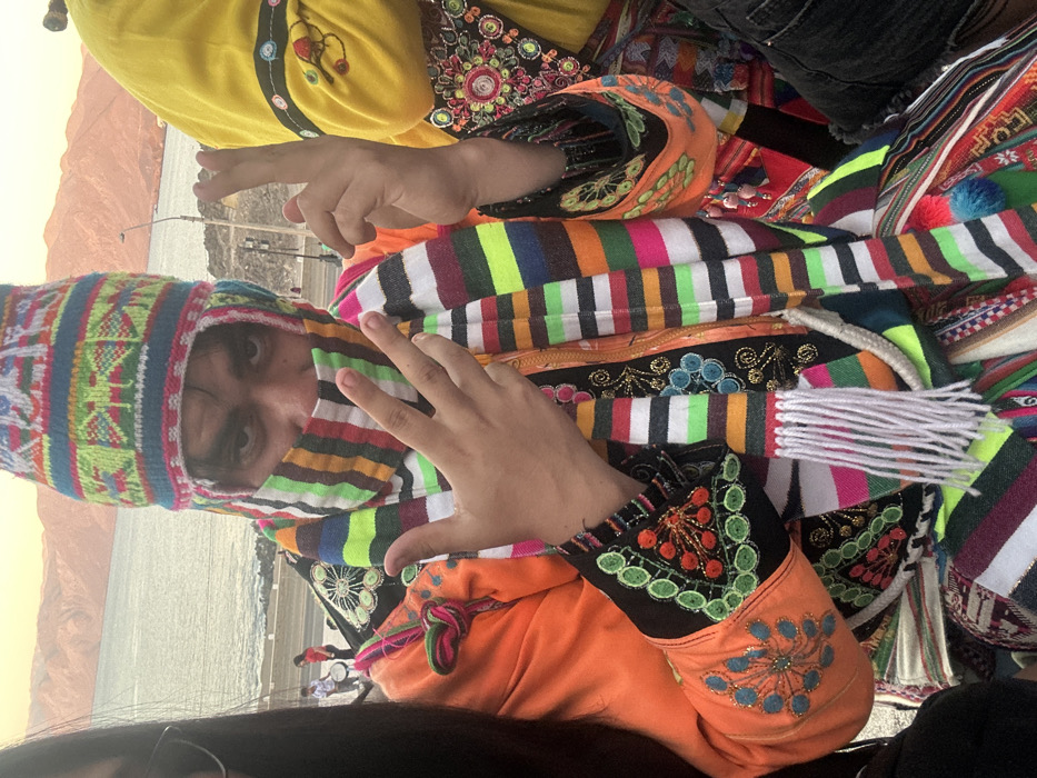 Two people wear traditional Peruvian attire. The foreground figure sports a colorful striped scarf, a patterned hat, and an orange top with embroidered sleeves. They are making a peace sign. The background figure wears a yellow embroidered garment. They are also making a peace sign. A landscape with water and distant mountains is visible in the background.