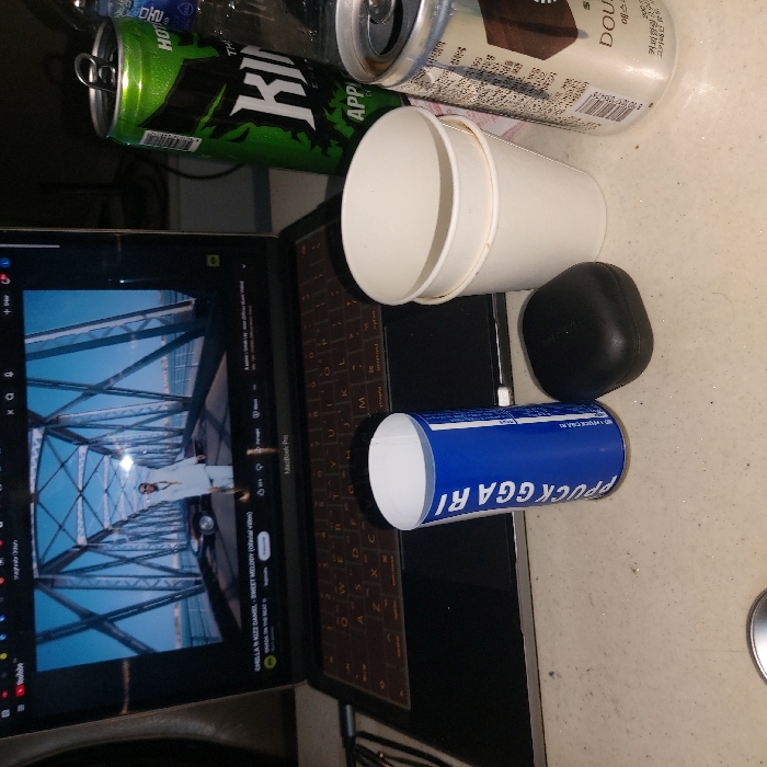 The scene depicts an indoor environment, likely a desk or table, in Gimpo-si, South Korea, characterized by low lighting. A black MacBook Pro laptop is open in the center, displaying a YouTube video on its screen titled "GHILLA R NIZZ DANIEL - SWEET MELODY (Official Video)." The video frame shows a person in a light-colored suit standing on a truss bridge, with a vintage car visible behind them. Arranged on the light-colored, speckled surface in front and to the right of the laptop are several items. From left to right: a blue cylindrical object with white text "PPUCKGGARI" printed vertically; a small, black, oval-shaped case, presumably for earbuds; two white disposable paper cups stacked together; a tall, open green aluminum can labeled "KiR" and "APPLE," identifiable as a HOTSIX energy drink; and an open silver and white aluminum can with Korean text, displaying "스타벅스" (Starbucks) and "DOUBLE SHOT," "에스프레소" (Espresso). A partially obscured clear plastic water bottle is visible behind the green can. Black cables are present on the left side of the laptop. No individuals are visible in the primary scene.