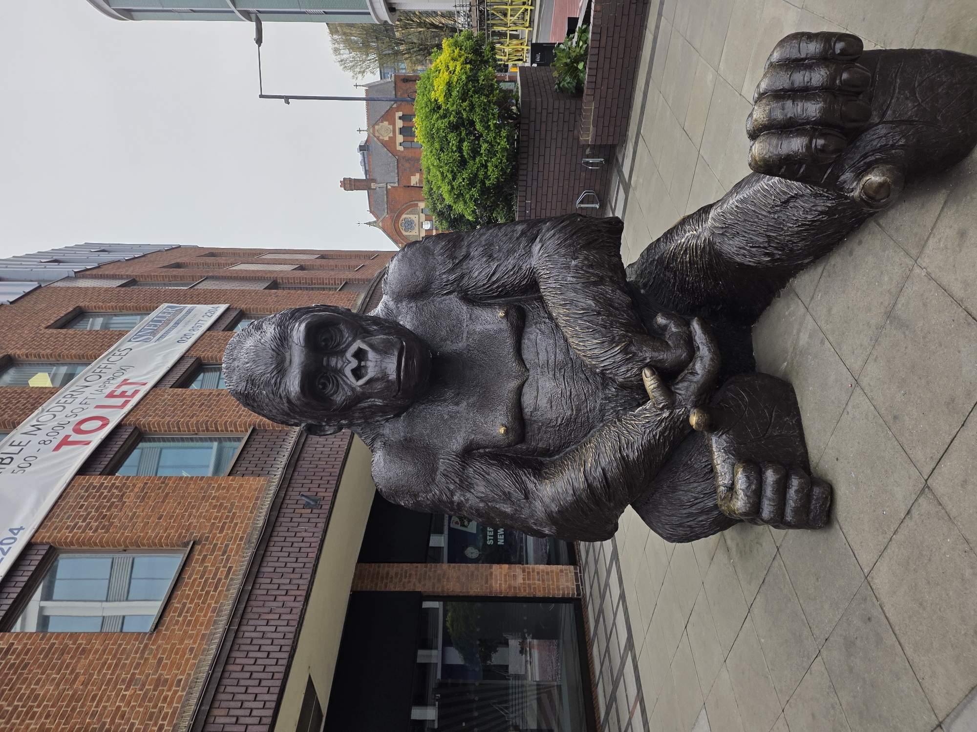 bronze sculpture of a gorilla sitting on the pavement in the city of London, United Kingdom. The sculpture appears lifelike and detailed, resting its large hands on the pavement. It's positioned outside a building with brick facades, and a banner advertising "MODERN OFFICES TO LET" is visible on the building's exterior. In the background, there are other buildings with red brick and a green tree. The sky is overcast, suggesting a cloudy day.