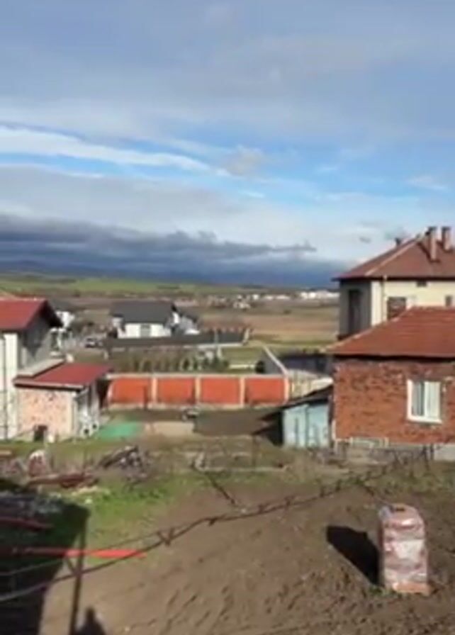 view from an elevated position looking out over a residential area. Houses with red and brown roofs are visible, interspersed with patches of green. In the foreground, there is a tilled patch of land. In the distance, fields stretch towards the horizon under a sky partially covered with dark clouds. A person's shadow is visible at the bottom of the frame. The overall impression is of a rural setting.