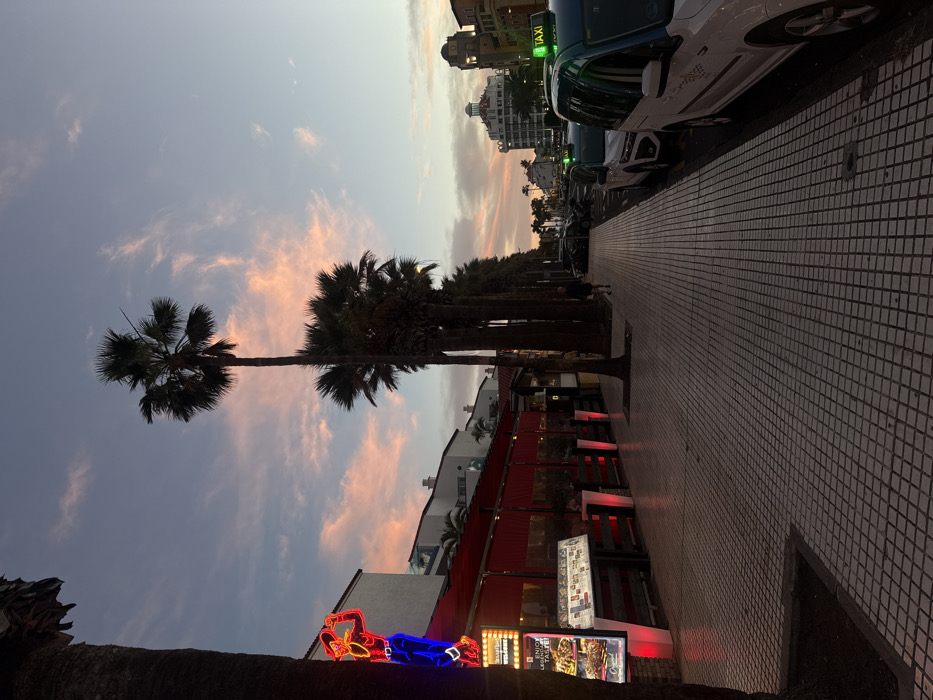 A sideways view features a palm-lined street at dusk. A towering palm tree dominates the left. Buildings with a red awning line the sidewalk, adorned with glowing neon lights. Taxis are parked along the right side of the street, where the tiled sidewalk extends into the distance. The sky is a blend of purple and pink hues, hinting at a beautiful sunset.