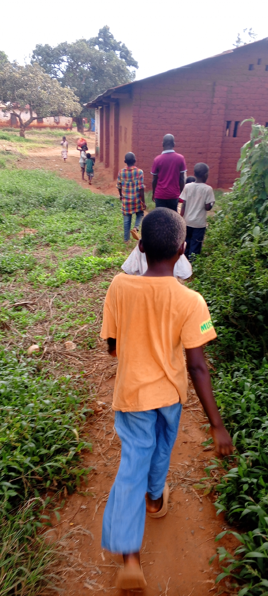 A group of people are walking on a dirt path in what appears to be Ngalula, Democratic Republic of the Congo. The focus is on a young boy in an orange shirt and blue pants walking away from the viewer. Behind him are several other people walking in the same direction. To the left is a red brick building. The path is surrounded by green vegetation. There are several buildings and trees in the background.