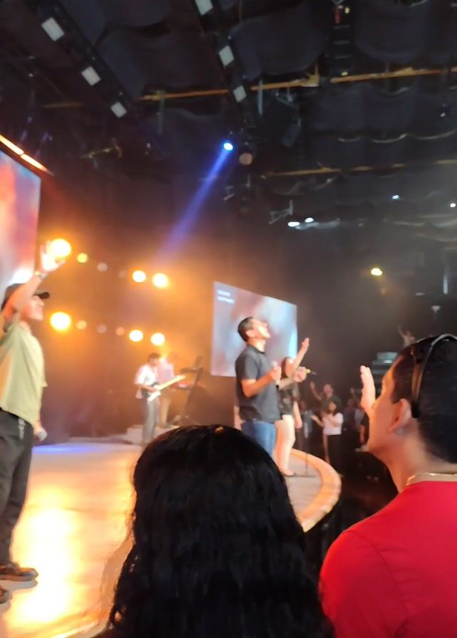The video captures a live performance in a large auditorium. A band is on stage performing, with a male singer on the left and another in the center. A guitar player is also visible on the stage. The stage is well lit with a mix of spotlights and color washes. Screens in the background show visuals. A large crowd fills the auditorium, most facing the stage and some raising their hands. The camera is positioned among the audience, showing the backs of heads and shoulders of people in the foreground. The overall atmosphere is energetic and lively.