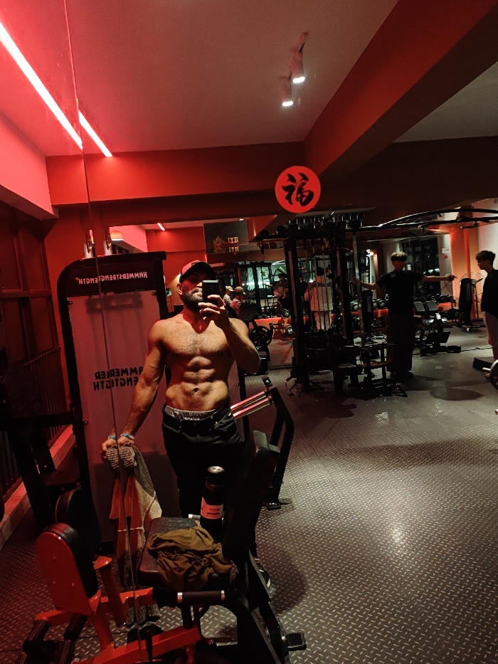 The image displays the interior of a gym, identified as likely being in the Chongqing High-tech Zone, China. A shirtless, bearded male subject, wearing a red baseball cap and dark pants, is centered in the frame, taking a mirror selfie with a dark smartphone held to his face. His torso exhibits defined abdominal muscles and chest hair. In his left hand, he holds a grey towel. He stands in front of a black weight machine, branded "HAMMER STRENGTH" (text reflected), which features a red padded seat. A dark water bottle and a crumpled item of dark clothing rest on the machine's seat. The gym's environment is characterized by strong red ambient lighting. Walls and ceiling beams are red, contrasting with white ceiling panels that house linear red LED strip lights and multiple white recessed spotlights. A prominent red circular sign displaying the Chinese character '福' (fú), meaning 'fortune' or 'good luck,' is mounted on a ceiling beam. The floor is dark grey with a textured diamond plate pattern. Several other individuals are present in the background. One man with dark, curly hair, wearing a dark t-shirt and pants, stands with his arms outstretched horizontally. Another individual, partially visible to the far right, wears a dark top. A third person in a white top is seen further back near a multi-gym station. Various pieces of black gym equipment, including weight racks, benches, and other machines, are arranged throughout the space.