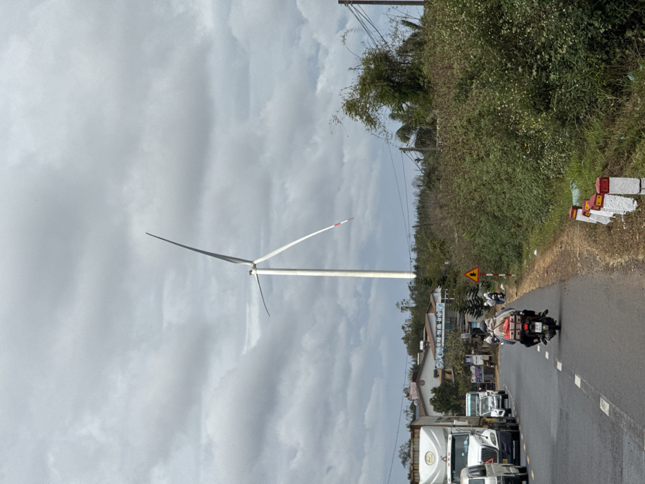 The image captures a road scene in the city of Thuận Thành, Vietnam, under a uniformly overcast sky. A prominent white wind turbine, featuring three blades with one tip marked in red and white stripes, stands stationary in the mid-ground, positioned on an elevated, vegetated area. The asphalt roadway, spanning the lower left and central frame, is delineated by a broken white center line and a solid white fog line on the right. A dark-colored motorbike, carrying a driver and a passenger both wearing helmets, travels away from the viewer in the right lane. The passenger is burdened with a light-colored bundled item on their back and a red box behind them. In the left lane, a line of traffic proceeds in the same direction, including a white semi-trailer truck, a white utility van, and several other vehicles. The right roadside comprises a dirt shoulder, bordered by a series of white and red painted concrete bollards. Beyond this, dense green shrubbery and foliage line the road, with utility poles and overhead lines visible further back. A yellow triangular warning sign with a black symbol is affixed to a pole on the right. In the left background, amidst trees, multiple buildings are discernible, one featuring a partially legible "CÀ PHÊ PHA ... - LÂU VIỆT" sign.