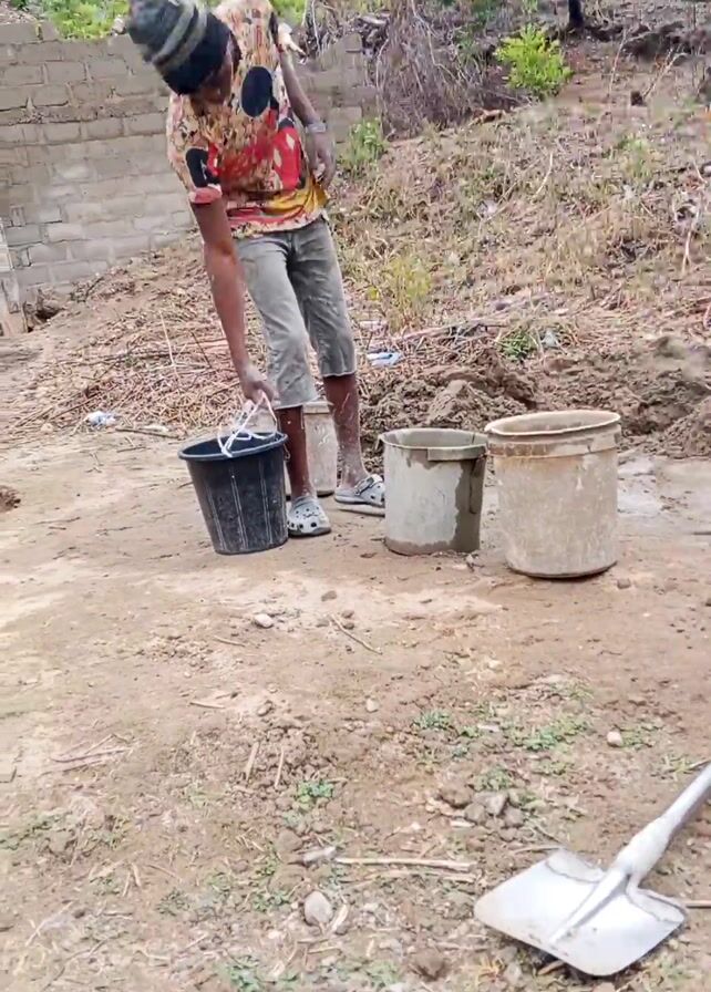 The video depicts a man carrying a bucket across a dirt surface