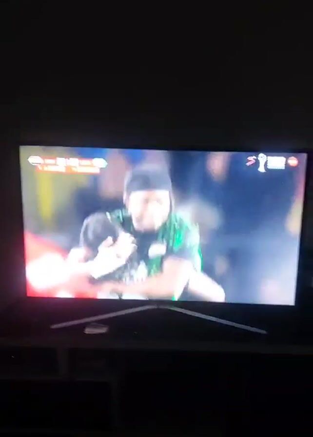 television screen. The screen shows a live broadcast of what appears to be a soccer match. At first, two players in green and white uniforms are shown embracing. The video then cuts to a shot of a goalie sitting on the grass. He is wearing a purple jersey with red gloves. The grass is green and appears to be artificial turf. The scene is brightly lit. The television sits on a black stand. The room is dimly lit.