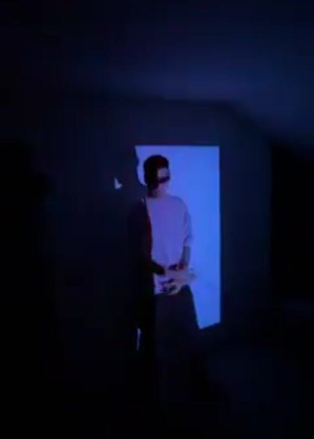 The video depicts a person wearing sunglasses and a light-colored t-shirt in a dark room. The person is standing in front of a rectangular red light that is also casting a shadow. The person poses, puts their arms on their chest, and dances with casual hand movements in front of the red light.