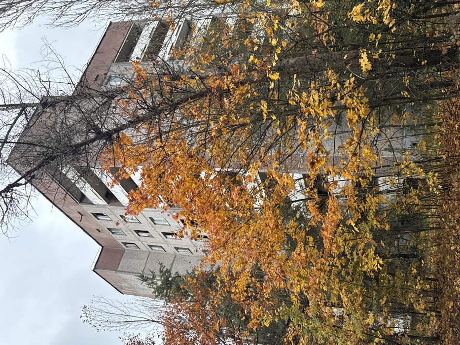 The image presents an exterior view of an abandoned multi-story residential building located in Prypiat, Ukraine. The structure, constructed primarily of light grey concrete panels, rises against an overcast, grey sky. Its facade exhibits weathering, with multiple floors featuring numerous empty window apertures. Partially deteriorated white concrete balconies are visible on the upper levels, some showing missing sections. The uppermost section of the building is clad in a darker, reddish-brown material. The foreground and midground are dominated by a dense growth of trees and shrubs, displaying prominent yellow and orange autumn foliage. A coniferous tree is visible towards the left, partially obscuring the building's lower levels. Numerous bare tree branches are intertwined with the leaf-laden trees. The ground beneath the vegetation is covered with a layer of fallen autumn leaves. No individuals, animals, or evidence of recent human activity are observed within the frame.