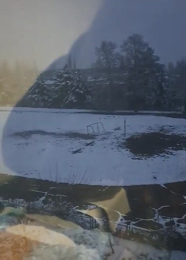 The scene is a snow-covered park or field, viewed through a window with some colorful light reflections. The ground is mostly white with patches of exposed darker ground. A paved path, partially covered with snow, curves through the area. In the background, there are trees and a building. The overall lighting suggests a cloudy or overcast day. A shadow of something is visible in the top left of the frame.