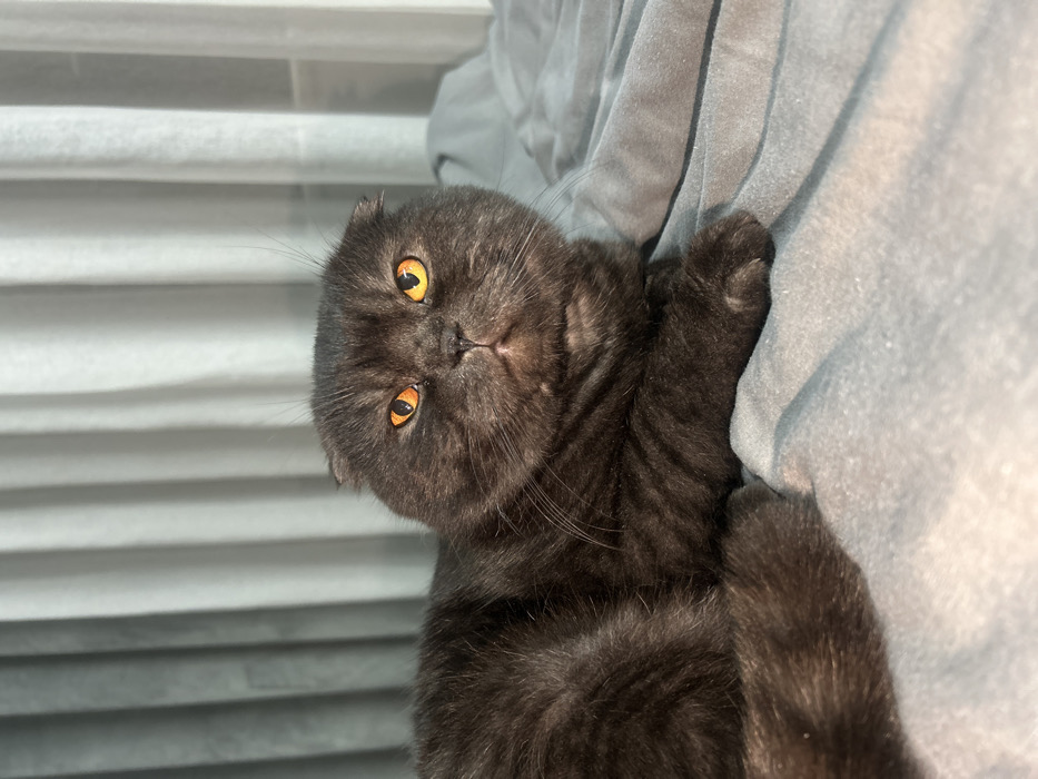 - "A Scottish Fold cat with dark, charcoal-black fur and subtle tabby markings is depicted lying on light gray, textured bedding in an indoor setting within the city of Dobrich, Bulgaria" by FM-Wzjle2, licensed under CC BY 4.0