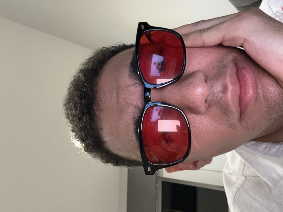 A close-up portrait shows a male individual with dark, curly hair and visible stubble, looking directly forward. He wears black-framed glasses with distinct red-tinted lenses. His brow is slightly furrowed, and his left hand supports his chin and lower cheek. He is dressed in a light-colored collared shirt. Reflections are prominent in both red lenses: the left lens reflects a bright, rectangular light source or screen, while the right lens clearly shows a person wearing a red or orange baseball cap and possibly a headset, positioned in front of a desk or console. The background is blurred, revealing a light-colored wall and a vertical dark architectural element or piece of furniture to the left. The scene is an indoor environment, likely a room within a residence or office building, located in London, United Kingdom.
