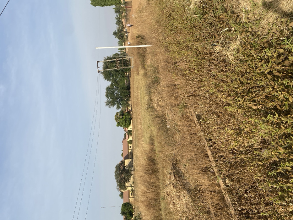 The scene depicts an outdoor area in Maigizo, Nigeria, under a clear, light blue sky. The foreground is dominated by dry, brown grasses and weeds, with a horizontal concrete beam partially visible in the lower-left. In the midground, a dirt path or road extends towards the right, flanked by additional dry vegetation. A tall, brown wooden utility structure, equipped with crossarms and insulators, is prominently positioned on the right side of the midground, directly adjacent to a vertical white pole. In the background on the left, a cluster of single-story buildings with light-colored walls and reddish-brown tiled roofs is visible, interspersed with several trees. A slender white antenna-like pole rises above the buildings on the far left. Two human figures, wearing light-colored clothing, are observed walking away from the viewer on the dirt path in the mid-right background. No discernible interactions occur between these individuals. The environment suggests dry conditions.