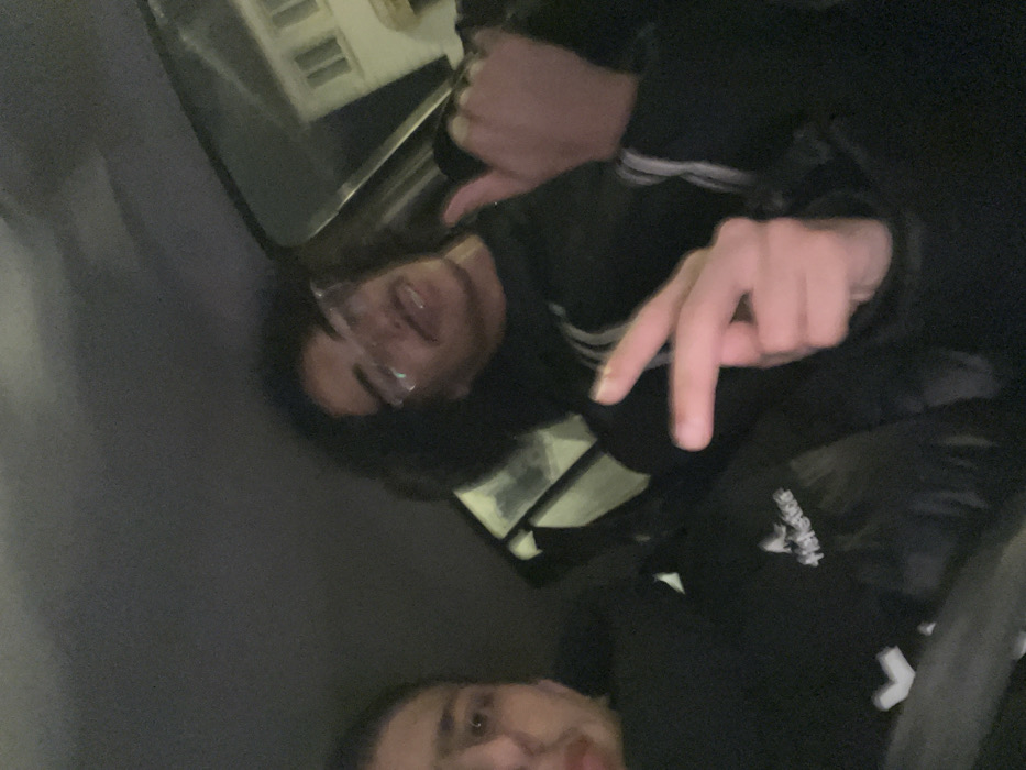 two people inside a car, likely at night. One person with curly hair and glasses is visible towards the top, while another is seen partially at the bottom. One hand is making a "peace" sign. A building's reflection is seen in the car window. The overall lighting is dark.