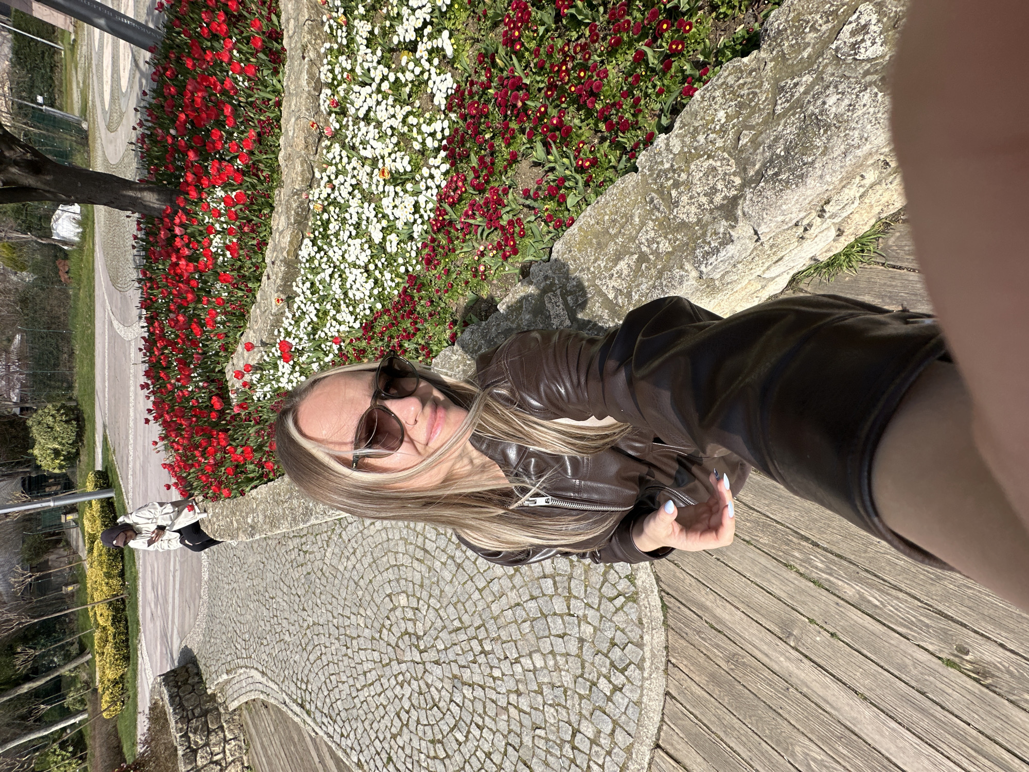 The image depicts an outdoor scene within a park or public garden in Başakşehir, Turkey, captured from a low, upward-angled perspective. In the immediate foreground, a light-skinned female with long, blonde-highlighted hair, dark sunglasses, and a brown zippered leather jacket is featured. She is smiling faintly, extending her right arm, holding a camera device to take a selfie. Her fingernails are painted light blue. She stands on a wooden plank walkway adjacent to a multi-tiered stone retaining wall. Beyond this wall are cultivated flower beds containing dense arrangements of red tulips, white daisies, and smaller dark red flowers. In the background, to the left, a second individual is seated on a low stone barrier or bench. This person wears a light-colored hooded garment and dark pants, and is observed looking down at a smartphone. A white cup rests on the barrier next to them. The park features grey cobblestone pathways arranged in circular patterns, several trees with bare branches, and green shrubs, all illuminated by bright sunlight, casting distinct shadows.