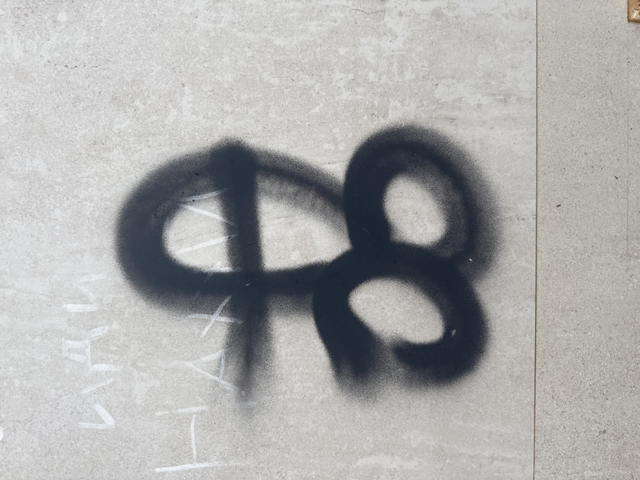 The image depicts a section of a light-colored, textured wall in Budva, Montenegro. The wall exhibits a horizontal seam or joint near the bottom. The primary subject is dark grey spray paint forming a stylized, abstract symbol resembling a phallus, centrally located. Above and to the left of this spray paint, white chalk or scratched Cyrillic letters are visible, spelling "ИДИ НАХ**", a common vulgar phrase. No individuals or active events are present in the scene; the marks represent past human actions.
