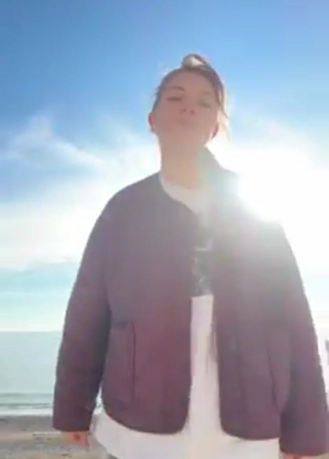 A young woman stands on a beach on a sunny day. She is wearing a maroon quilted jacket, a white t-shirt, and blue jeans. Her hair is pulled back in a ponytail. In the background, there is a beach, the sea, a clear blue sky with some clouds, and the sun. The woman initially faces the camera, then poses and adjusts her hair, turns to face the sea, and then turns back towards the camera again.