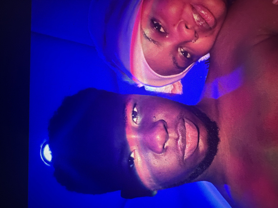 Two people are close together, bathed in blue light with hints of pink and red. The person on top has a light pink head covering, pierced nose, and glossy lips. The person below has short dark hair and facial hair, with a light stripe across their nose. Their mouths are closed, and both are looking at the camera. The overall image has a casual, intimate feel.
