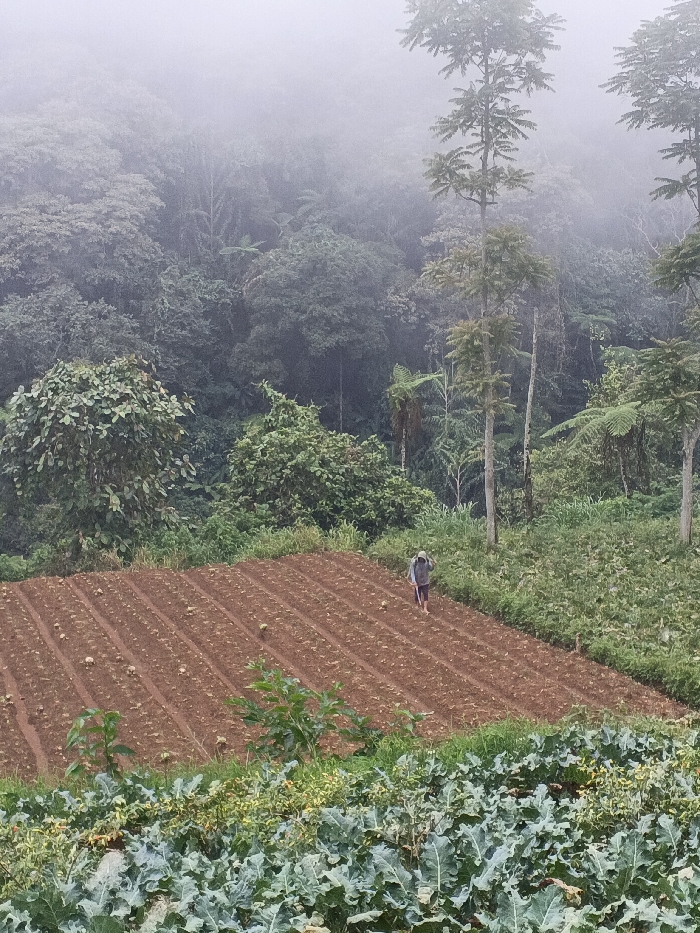 A rural agricultural landscape in Pinnwe, Myanmar (Burma), is depicted under misty atmospheric conditions. The upper background features a dense, fog-obscured rainforest canopy, with several tall, slender trees rising through the haze. In the mid-ground, a terraced cultivated field of reddish-brown soil is arranged in parallel, tilled rows, containing scattered small, light-colored objects consistent with recently planted crops. A single individual, dressed in a light-colored hooded top and dark lower garments, stands within this field, holding a long-handled agricultural tool and engaged in soil work, facing towards the left side of the frame. The immediate foreground presents a separate section of dense green vegetation, consistent with a crop of large-leafed plants such as cabbage or broccoli.