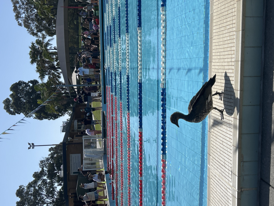 A sideways view of a swimming pool shows multiple lanes divided by red, white, and blue markers. On the pool's edge stands a brown duck with black spots. A crowd of people is standing under a large awning and on the side of the pool. In the background, green trees reach up toward the sky.