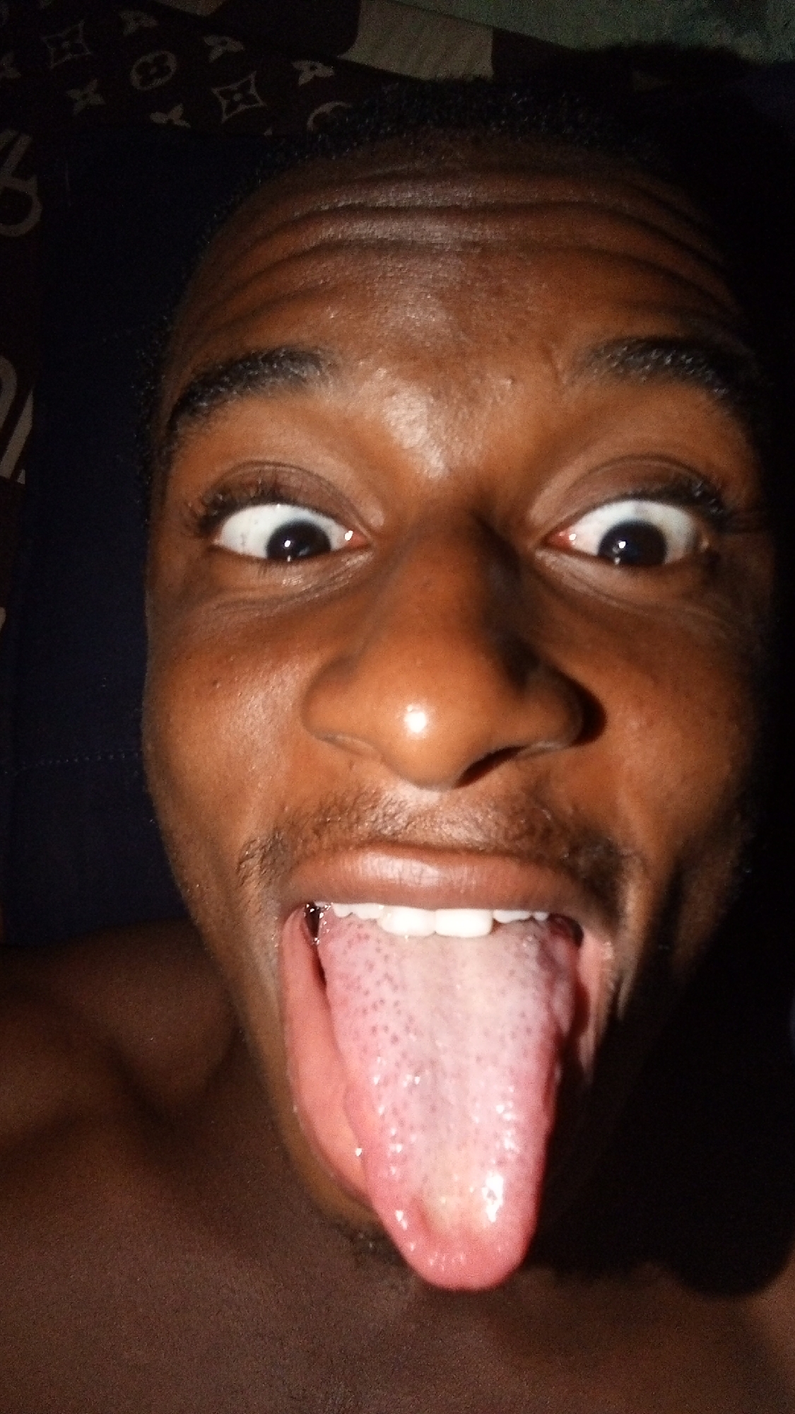 A close-up, front-facing portrait depicts a single individual, male, with dark skin, captured from the upper chest to the top of the head. The individual exhibits an exaggerated expression: eyes are wide open with visible sclera surrounding the irises, eyebrows are raised, creating horizontal wrinkles across the forehead. The mouth is open, with a pink tongue fully extended forward, displaying prominent papillae on its dorsal surface. White teeth are visible along the upper dental arcade, and a small metallic object, possibly an oral piercing, is visible in the upper oral cavity, near the frenum. The individual appears shirtless, with dark skin visible on the shoulders and upper chest. The background is dark, featuring a repeating pattern of light-colored, stylized letters or symbols (resembling 'LV' monograms), consistent with a fabric such as a pillowcase or bedding. Direct artificial light illuminates the subject's face, creating highlights on the forehead, nose, and lips, while the rest of the environment remains dimly lit. There are no visual cues within the image to determine the specific location in Onitsha, Nigeria.