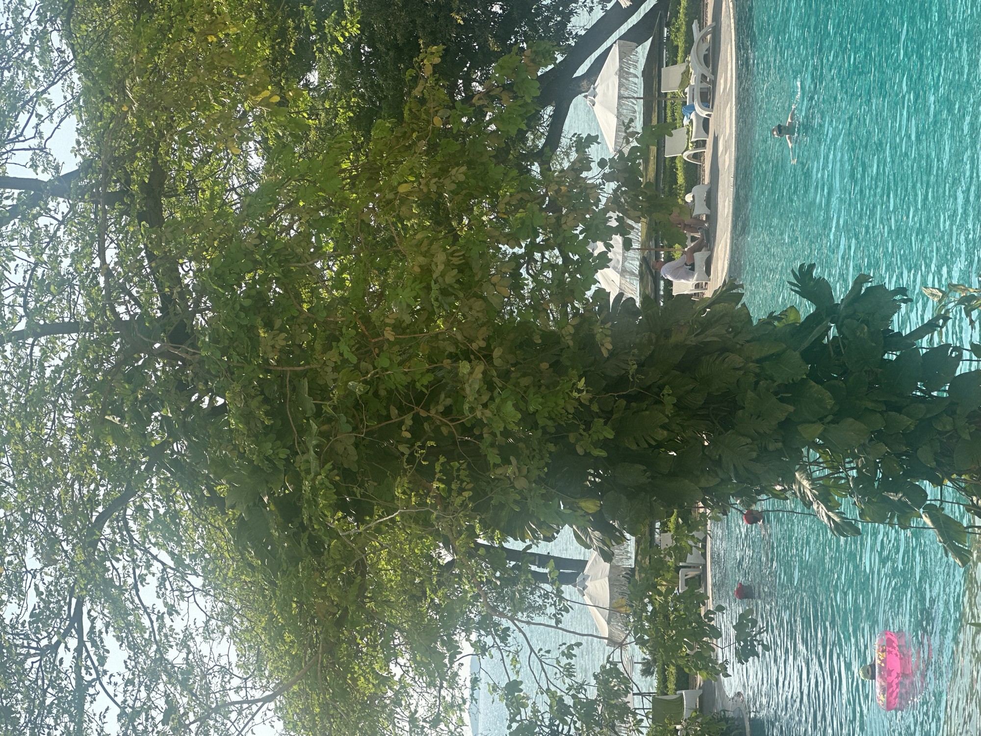 The image depicts a scene at a location near a body of water, possibly a sea or a large pool, in Pattaya City, Thailand. There is a tall tree with dense green foliage dominating the left side of the image, obscuring part of the view. To the right of the tree is a bright blue pool with several people swimming. Along the edge of the pool are white lounge chairs with white umbrellas providing shade. The water appears clear with visible wave patterns. Other vegetation is present along the pool's edge. The sky is partially visible through the tree branches.