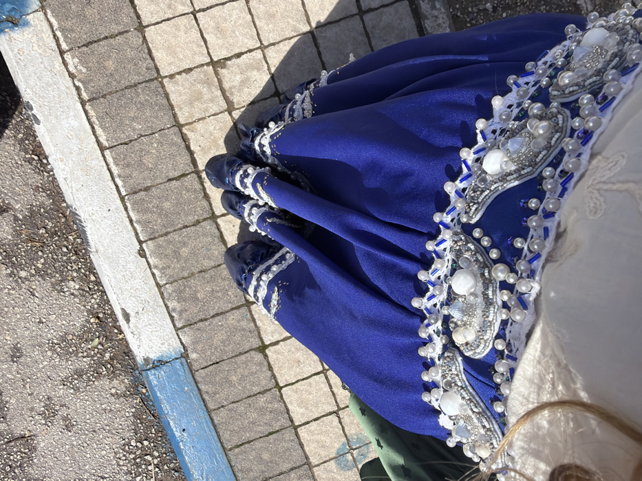 An overhead view captures a person standing outdoors on a paved sidewalk in Safed, Israel. The subject is wearing a royal blue dress or skirt made of a lustrous fabric, likely satin, heavily embellished along the hem with white and blue beads, pearls, and small white seashells, bordered by white lace or trim. Dark blue footwear, possibly matching the dress and adorned with similar white embellishments, is visible on the feet. A light-colored upper garment is partially visible at the bottom left. The sidewalk consists of grey square pavers. To the left, a curb is present, painted white on its upper surface and blue on its vertical face, adjacent to a darker, granular ground surface. The scene is brightly lit by direct sunlight, casting distinct shadows.