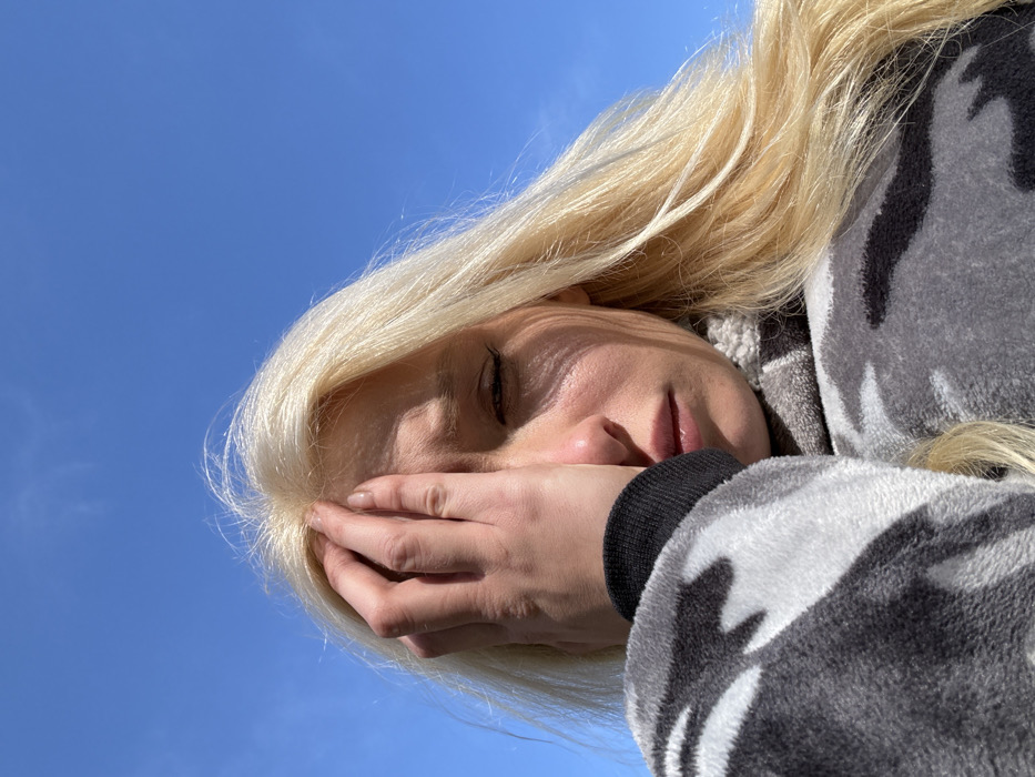 A close-up image depicts a single individual, identified as a female with long, light blonde hair, outdoors against a clear blue sky, presumably in Bistrica, Montenegro. The subject's left hand is positioned over the left side of her face, covering her left eye and part of her forehead. Her right eye is partially closed, and moisture resembling tears is visible on the lower eyelid and cheekbone. Direct sunlight illuminates the right side of her face, casting shadows from her hand and nose. She is wearing a soft, gray and white camouflage-patterned garment, possibly a hoodie, with a black ribbed cuff visible on the left sleeve. The inner lining of her collar or hood appears to be light brown fleece. No other objects or individuals are present in the frame.