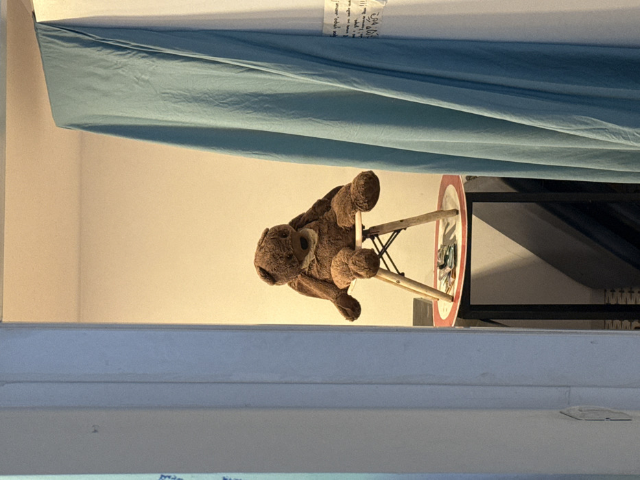 An indoor scene, presumably in Tel-Aviv, Israel, is observed through a partial doorway. A large, brown plush teddy bear, adorned with a cream-colored collar, sits positioned on a light-wood stool featuring splayed legs. This stool is situated atop a black-framed stand with a circular surface. Beneath the stool, a circular "No Entry" road sign replica with a red border and white center is visible, overlaid with several small, multi-colored folded items. The background presents a uniformly illuminated, warm-toned wall. To the right, a light blue fabric panel or curtain hangs vertically, partially covering a white wall bearing handwritten text, including the Russian phrase "Доброе утро!". The left edge of the frame reveals a section of a light-colored doorframe.