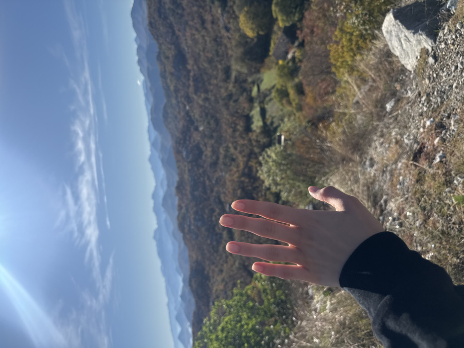 The image presents an elevated view of a mountainous landscape in Gornja Brova, Montenegro, under a clear, sunny sky. In the lower-left foreground, a human left hand with fair skin, partially covered by a dark-colored long-sleeved garment, is held vertically with fingers extended. The immediate ground consists of dry grass, small rocks, and sparse vegetation. The midground features a valley extensively covered by deciduous trees displaying autumn colors, interspersed with green clearings and several small structures. Layered mountain ranges extend into the distant background, appearing progressively lighter blue. The sky is clear blue with wispy white clouds, and a prominent sun flare is visible in the upper-left corner.