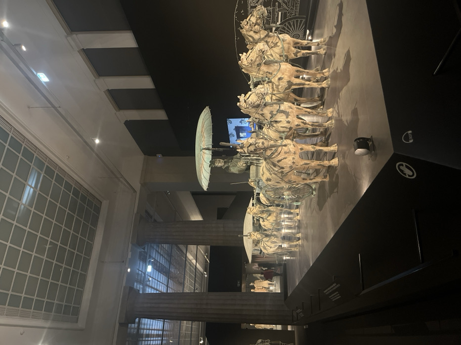 The image displays an exhibition hall within the Hungarian National Museum in Budapest, Hungary. The central focus is a historical artifact display on an elevated, dark-colored platform. This display features a terracotta war chariot with a seated driver figure beneath a large, circular, greenish canopy, drawn by a team of four terracotta horses. A second, similar chariot and horse team are positioned behind the primary display. All terracotta figures exhibit a mottled light brown and dark brown coloration. In the left background, additional standing terracotta warrior figures are visible. The architectural environment includes tall, fluted, grey columns on the left side of the frame and a prominent square-gridded glass ceiling. A dark wall on the right features white line-art schematics, depicting historical vehicle components. Several blurred human figures, identified as visitors, are present in the distant left background, observing the exhibits. The scene is illuminated by overhead lighting and focused spotlights directed onto the displays.