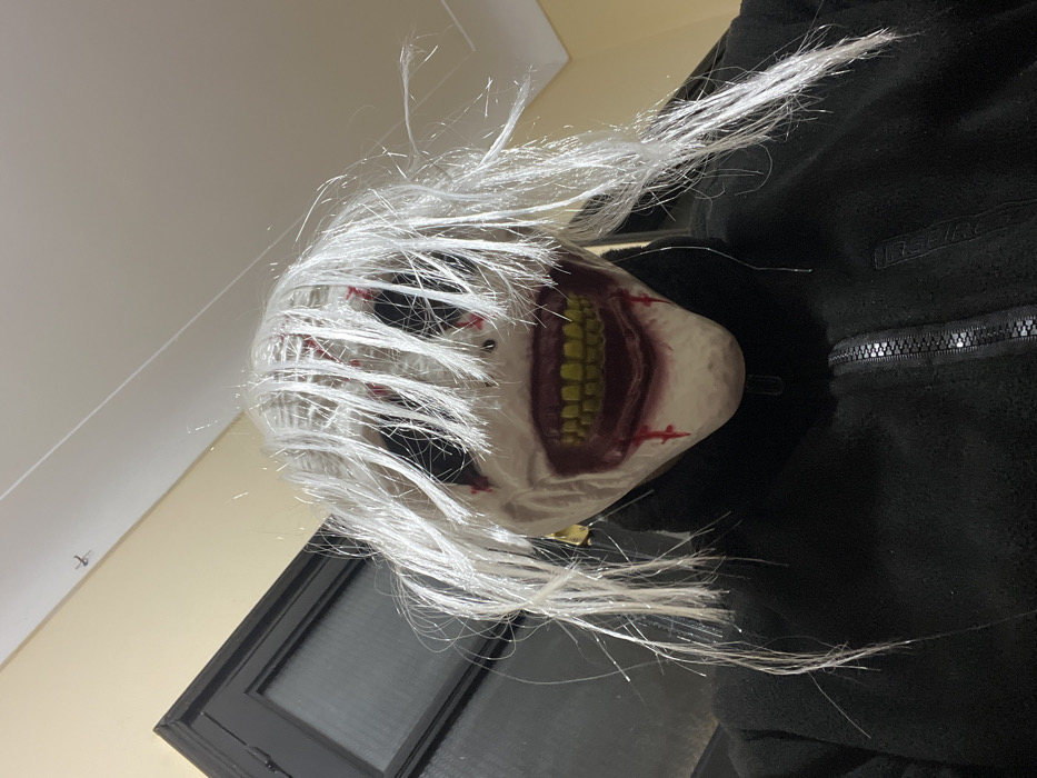 A disturbing mask with white stringy hair is featured prominently. The mask's face is pale, with prominent red stitches and a gaping mouth revealing yellowish teeth. The mask is positioned at an angle, almost looming downward. A dark, zippered garment is visible adjacent to the mask, suggesting it is being worn. A beige wall and black window frame are visible in the background.