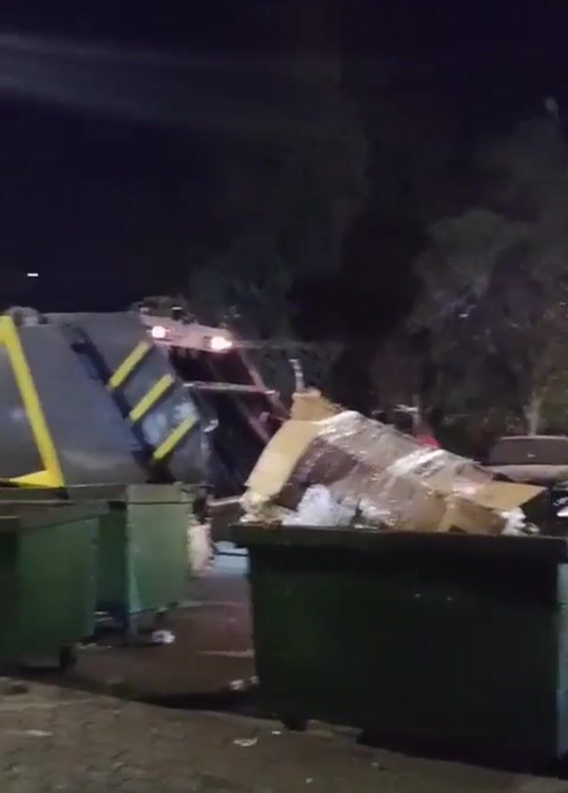 yellow and gray garbage truck at night, lifting a dumpster to empty it