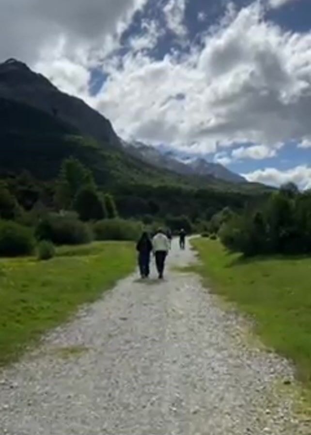 gravel path with three people walking along it, seen from behind. The path stretches into the distance, flanked by green grass and bushes on either side. Tall mountains dominate the background, partially covered with trees and some visible snow at higher elevations. The sky is partly cloudy, with the sun peeking through. The walkers are spaced out, with two closer together in the foreground and one farther ahead.
