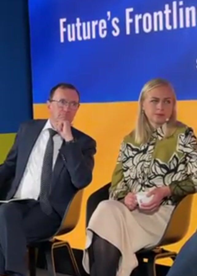 two people seated on a stage during a conference. The stage backdrop is a blue and yellow sign that reads "Future's Frontline." A man wearing glasses, a dark suit, and a tie sits with his chin resting on his hand. A woman in a floral print blouse and tan skirt is seated next to him, holding a white mug. The video focuses on the two individuals, and a small portion of a person wearing blue jeans is visible on the right side of the frame. The setting appears to be a conference or panel discussion.