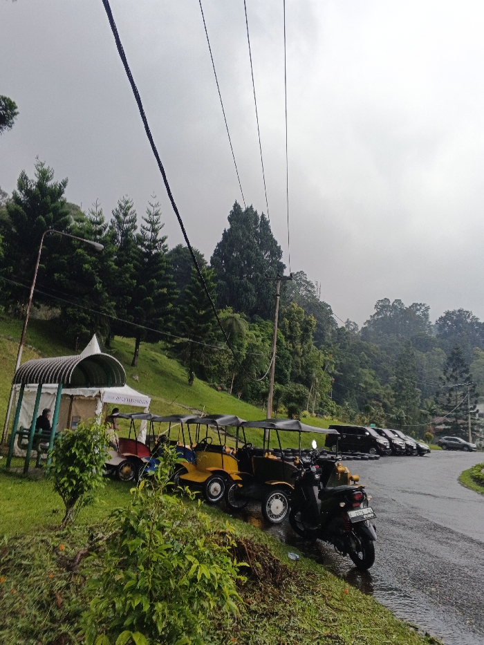 Under a cloudy sky, a line of colorful vintage-style golf carts sits parked on the grass next to a small sheltered kiosk. A black motorcycle is parked nearby. A paved road winds uphill, lined with parked vehicles, including dark-colored cars and vans. Trees cover the hillsides. Power lines stretch across the frame. The scene appears damp, possibly after or during light rain.