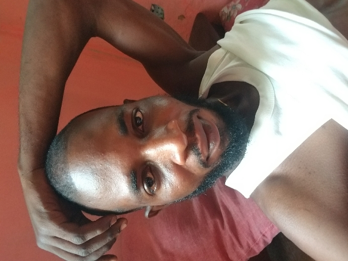 A man with dark skin and a close-cropped haircut is shown. He has a full black beard. He wears a white T-shirt. The man's face is prominent, with visible eyes, nose, and mouth. His left arm is raised near his head. The background appears to be a bed covered with red and orange sheets. The image is taken from a low angle, looking up at the man.