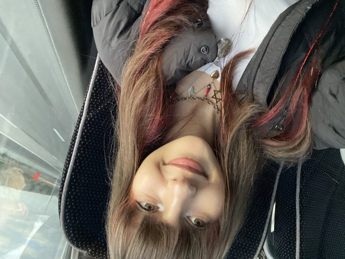 A young woman with brown hair and red streaks smiles towards the camera. She wears a black puffy jacket and a white shirt. A silver chain with various charms and pendants adorns her neck. She's seated, with a black and grey dotted seat visible behind her. A window is to her left, with a slight outdoor view visible through the glass.