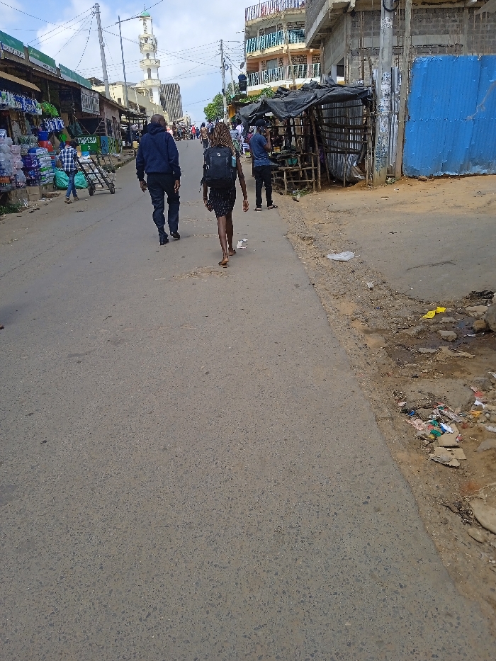 The image depicts a daytime street scene in Kitui, Kenya, viewed from a low angle behind pedestrians walking uphill on an asphalt road. In the immediate foreground, a male wearing a dark blue hooded jacket and dark pants walks to the left of a female wearing a dark patterned dress, a black backpack, and appearing barefoot. Both individuals are moving away from the camera. To the right of the road, an unpaved shoulder is visible, characterized by uneven dirt and scattered debris, including plastic bags and assorted refuse. Further along this right side, a makeshift vendor stall constructed from wooden poles and corrugated metal, covered by a black tarp, is present. A male in a blue shirt stands near this stall. Behind it, a blue corrugated metal gate or wall is visible, with a multi-story building featuring concrete block construction and balconies with red railings in the background. On the left side of the street, multiple open-front market stalls display merchandise such as bottled liquids and plastic goods. A male figure pushing a green handcart, partially labeled "M-PESA," is visible near these stalls. In the distant background, a white minaret with a green crescent at its apex stands prominently against an overcast sky. The street is lined with utility poles supporting an array of overhead electrical wires and cables. Several indistinct figures are visible further up the street, indicating ongoing pedestrian activity within this urban commercial environment.