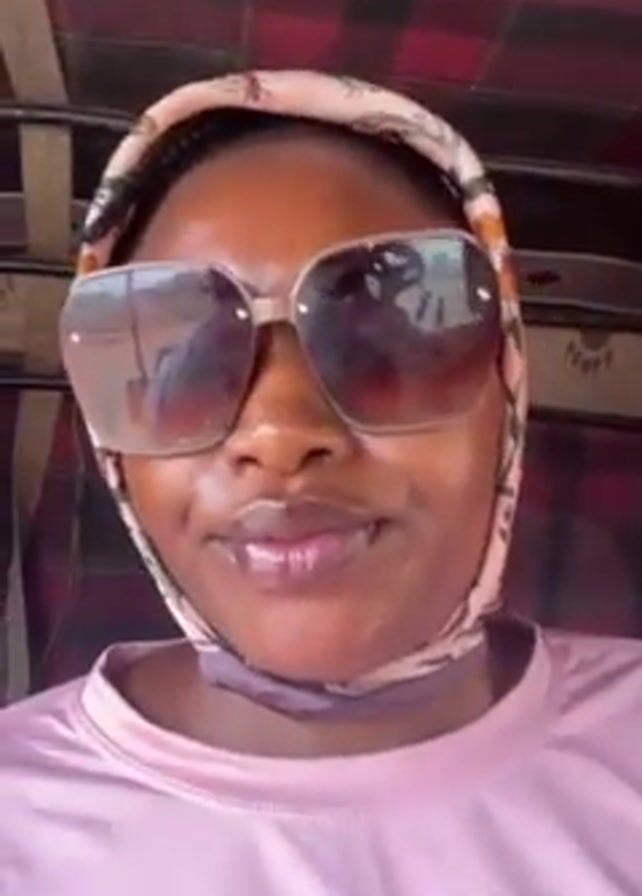 A woman with dark skin wears large sunglasses and a light pink headscarf with a floral print. She also wears a light pink shirt. She is inside a vehicle, possibly a tuk-tuk, as a red and black checkered pattern is visible in the background. The woman looks directly at the camera and slightly tilts her head. The background visible through the sunglasses appears to be an outdoor landscape.