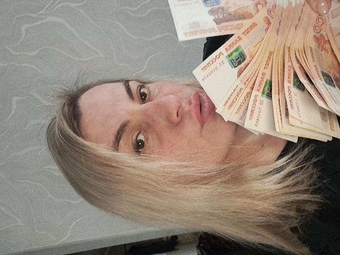 An adult female, appearing of European descent with blonde hair and brown eyes, is depicted indoors. She holds a fanned stack of numerous 5000 Russian Ruble banknotes in her right hand, positioned below her chin. Her lips are slightly puckered, and her gaze is directed towards the camera. She is wearing a dark top, partially visible. The immediate background is a light grey wall covered with patterned wallpaper featuring subtle, flowing wavy lines. No specific location within the city of Yegoryevsk, Russia, can be determined from the visual information present in the image.